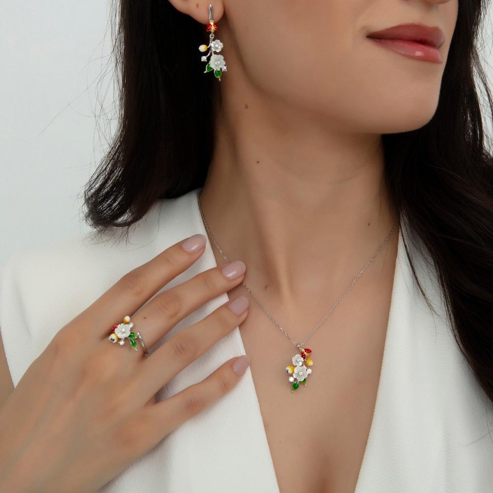 - إن المنتج يوجد بها زوجين من الحلق المميزين تم تصميمه أيضاً يحتوي على أجزاء من الصدف الملون من الفضة على شكل ورود ويوجد به فصوص الزركون ايضاً.